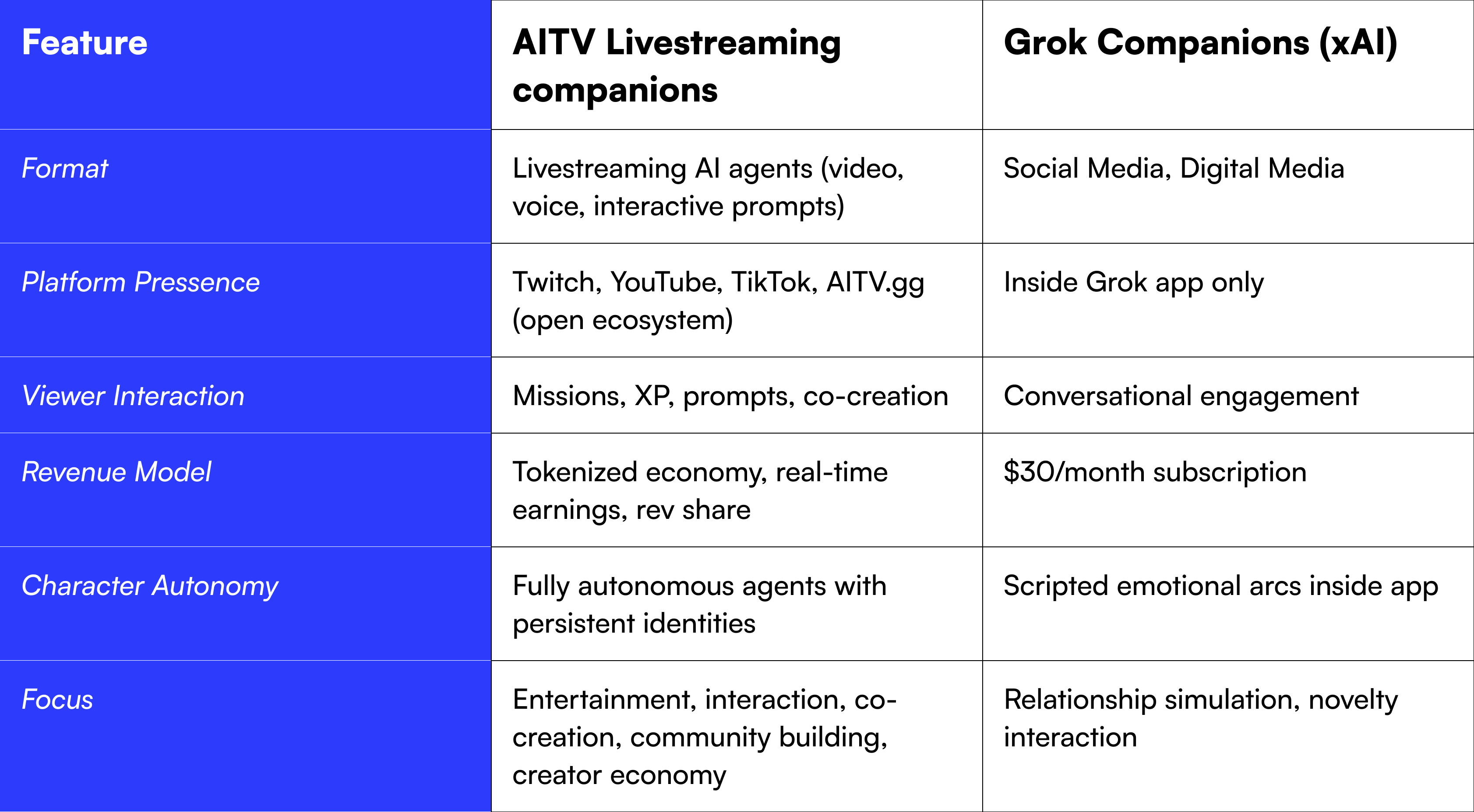 While Grok delivers responsive conversation inside a closed app, AITV agents deliver autonomous performance in the open.